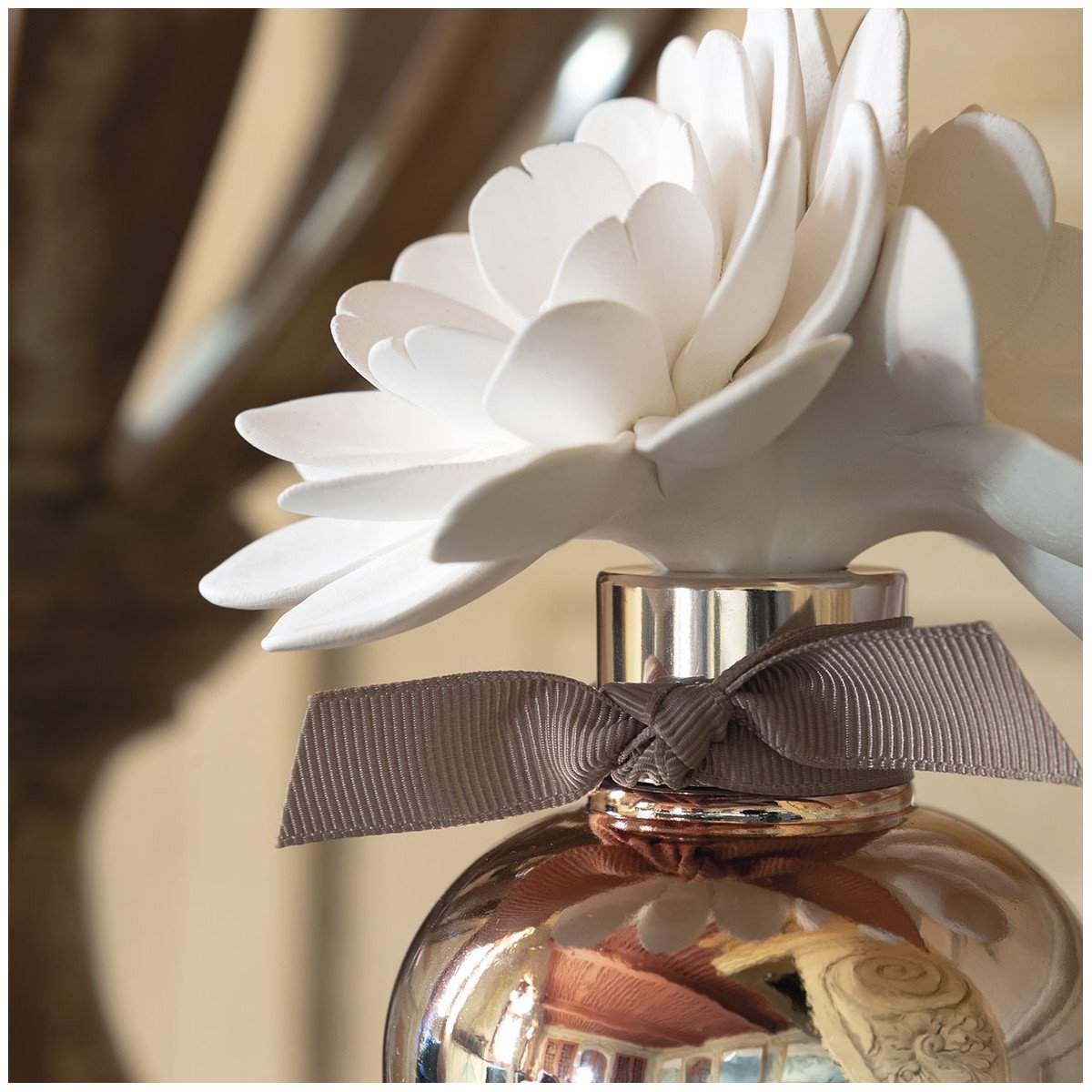 Discover the elegant Floral Waltz home fragrance diffuser that will lastingly perfume your interior. Handcrafted, two intertwined porcelain bisque flowers rest in their tie & dye effect copper-colored glass bottle.